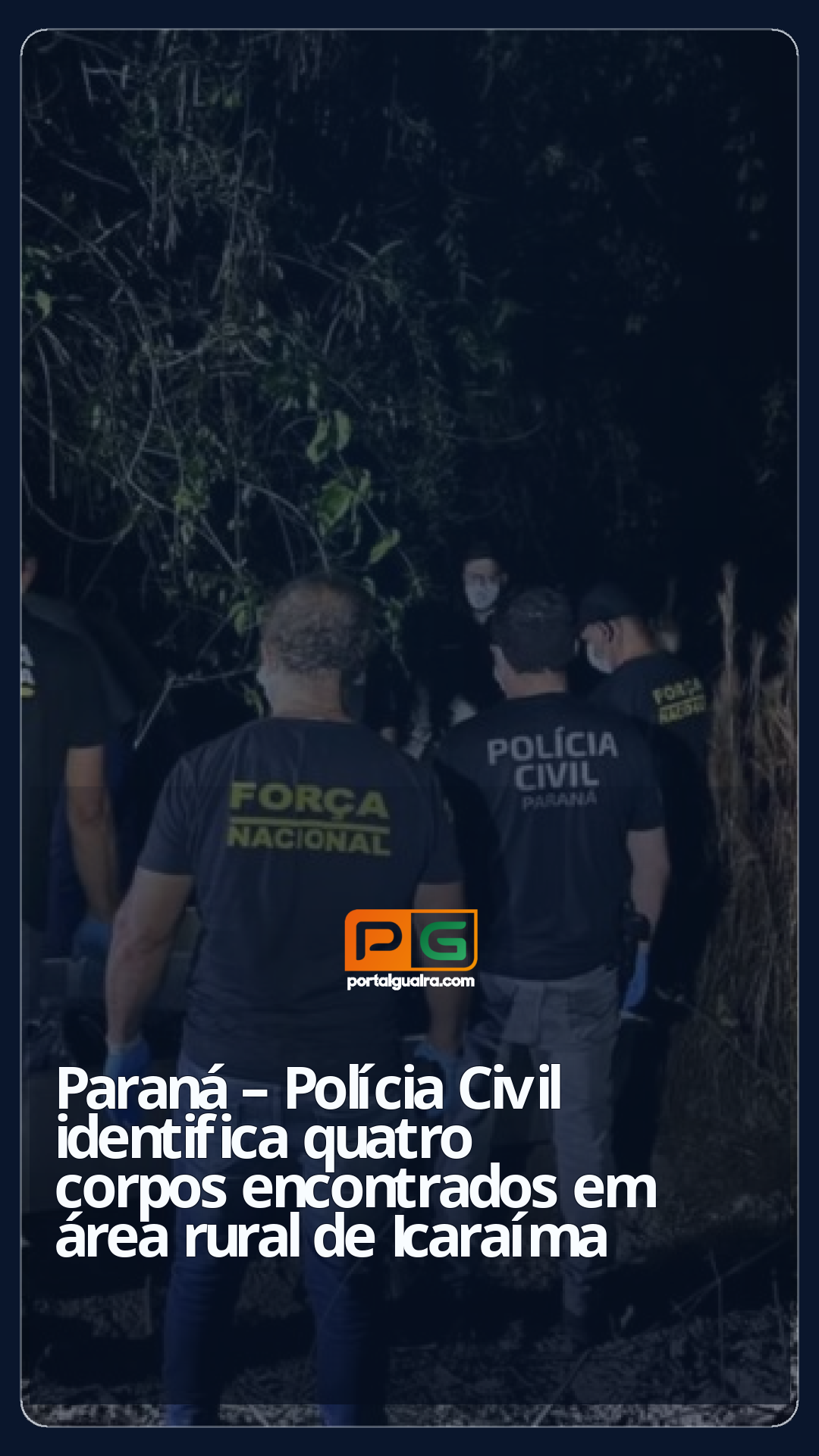 A Polícia Civil do Paraná (PCPR) identificou os quatro corpos localizados na madrugada de sexta-feira (19) em uma área rural de Icaraíma, no Noroeste do Estado. Após 44 dias de buscas, exames de necropapiloscopia confirmaram as identidades de Alencar Gonçalves de Souza Giron, Diego Henrique Affonso, Rafael Juliano Marascalchi e Robishley Hirnani de Oliveira.