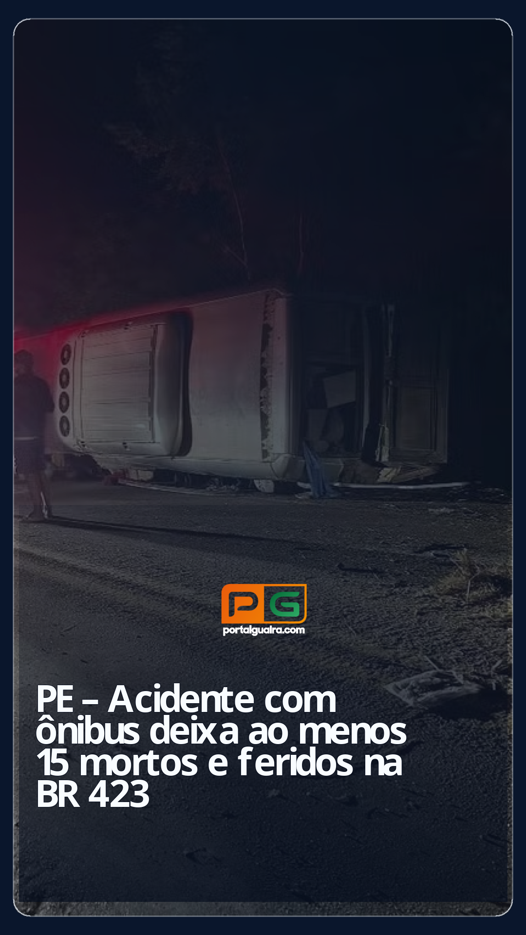 Um grave acidente com um ônibus deixou mortos e feridos, na noite desta sexta-feira (17), na BR-423, entre os municípios de Paranatama e Saloá, no Agreste de Pernambuco. Segundo informações preliminares repassadas pela Polícia Rodoviária Federal (PRF), o veículo transportava mais de 30 passageiros e 15 pessoas morreram no local, sendo 11 mulheres e quatro homens.