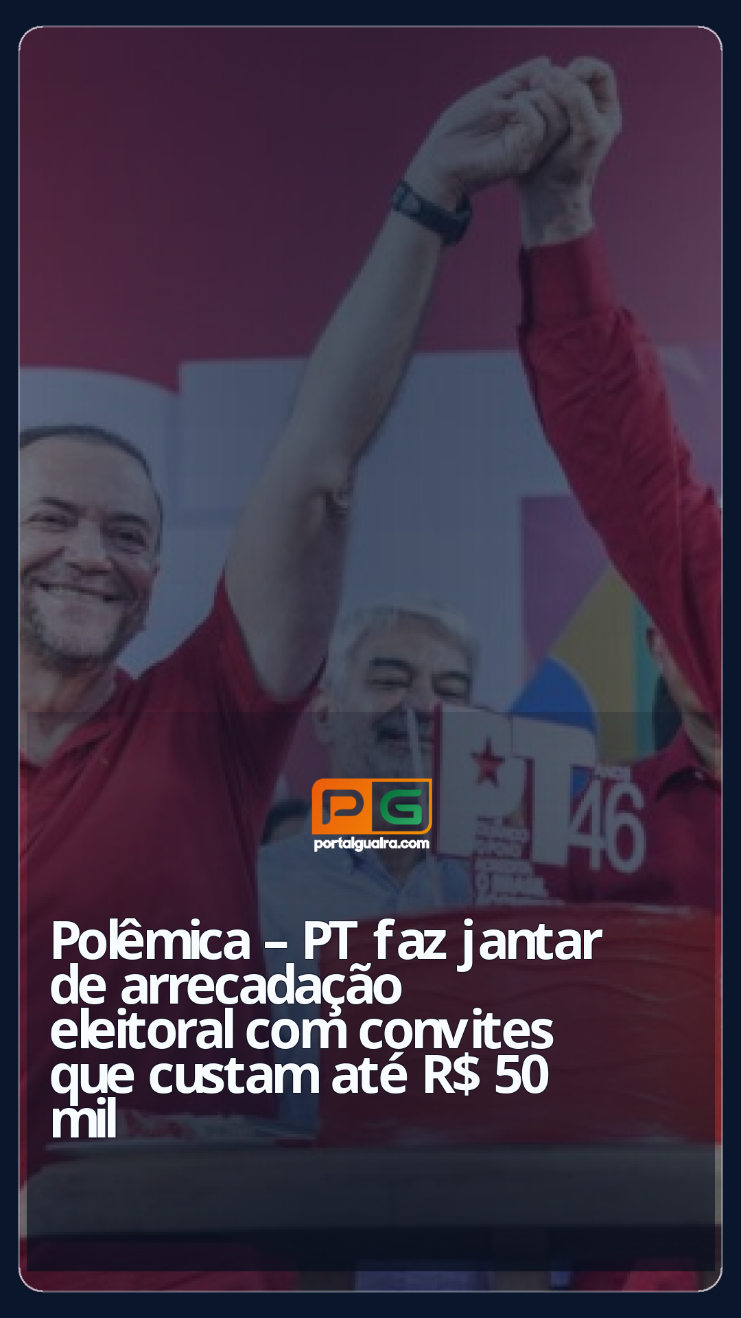 O Partido dos Trabalhadores (PT) fará, no dia 6 de abril, um jantar de arrecadação eleitoral e de comemoração aos 46 anos de fundação da legenda. Os convites para participar do evento, que será realizado em Brasília (DF), variam de R$ 1 mil a R$ 50 mil.