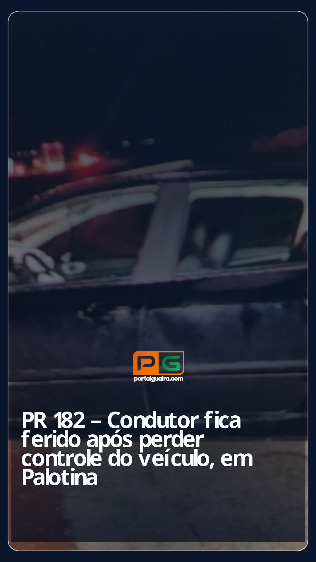 A Polícia Militar do Paraná, por meio da CPE, BPRv e da 3ª Companhia do PRV Iporã/Palotina, atendeu na noite de sábado (13), por volta das 21h15, um sinistro de trânsito com vítima na rodovia PR-182, no entroncamento com a PR-975, no trecho entre Palotina e Francisco Alves.