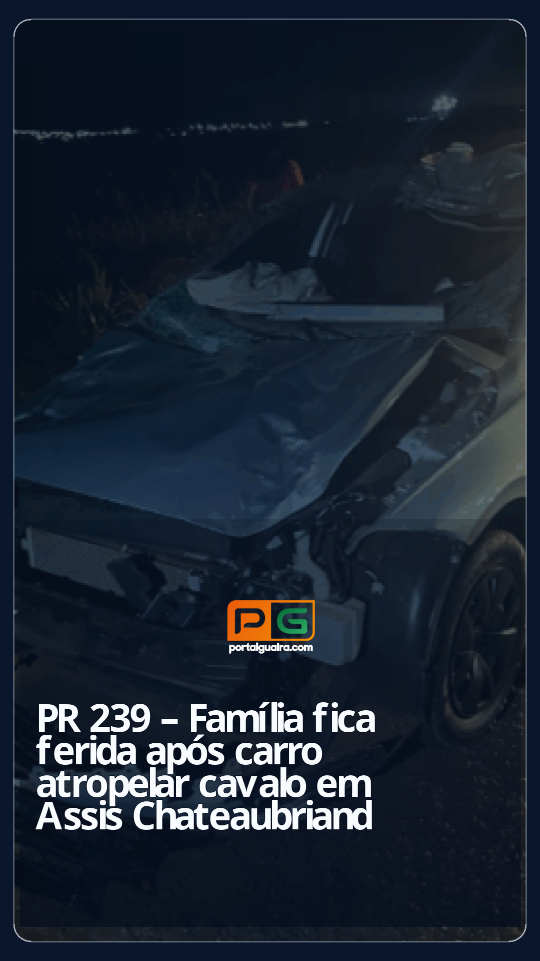 Um carro atropelou um cavalo na noite de sábado (24) na PR 239, em Assis Chateaubriand. O acidente aconteceu por volta das 23h30, no km 593, próximo ao trecho que liga o município a Toledo.