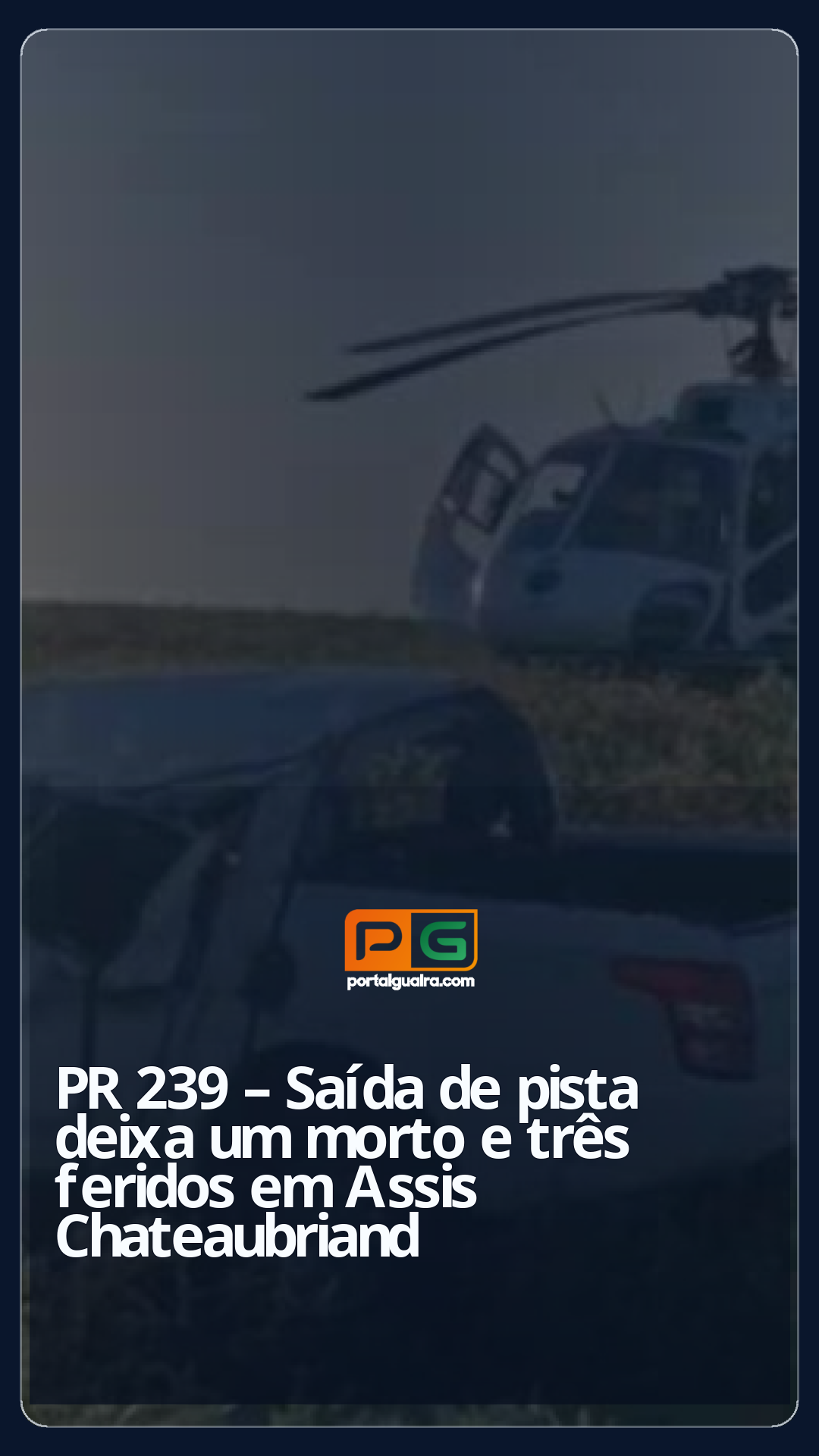Grave acidente de trânsito foi registrado na sexta-feira (23), na PR-239, nas proximidades da comunidade Santa Rita, em Assis Chateaubriand. A ocorrência terminou com a morte de um homem de 64 anos e deixou outras três pessoas feridas.