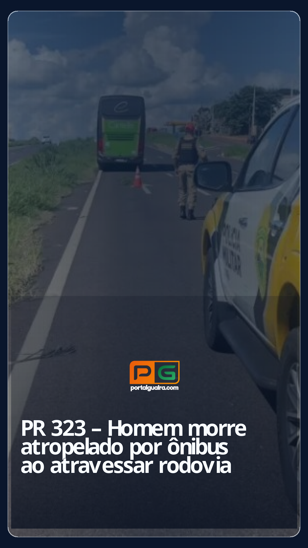 Conforme o motorista, ele trafegava pela PR-323 no sentido Cianorte/Maringá. Ao atingir o Km 175 + 800m, o condutor do coletivo se deparou com um pedestre que invadiu a rodovia. O transeunte acabou atropelado. De iniciais W.O.A.P. e 26 anos, o homem atropelado pelo ônibus morreu ainda no local.