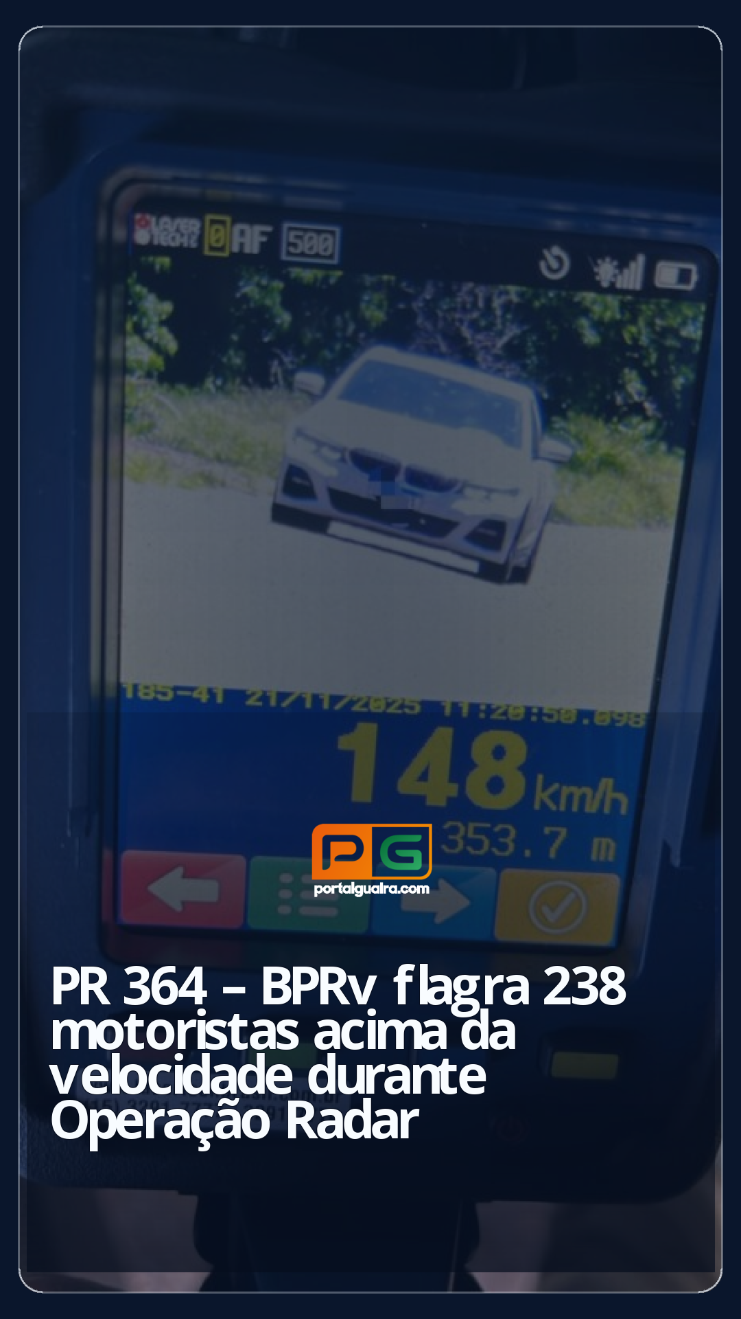 Em duas horas e meia de fiscalização, 238 veículos foram flagrados em excesso de velocidade, muitos deles circulando acima de 50% do limite permitido — situação que pode resultar na suspensão da CNH dos motoristas. No trecho, a velocidade máxima é de 80 km/h.