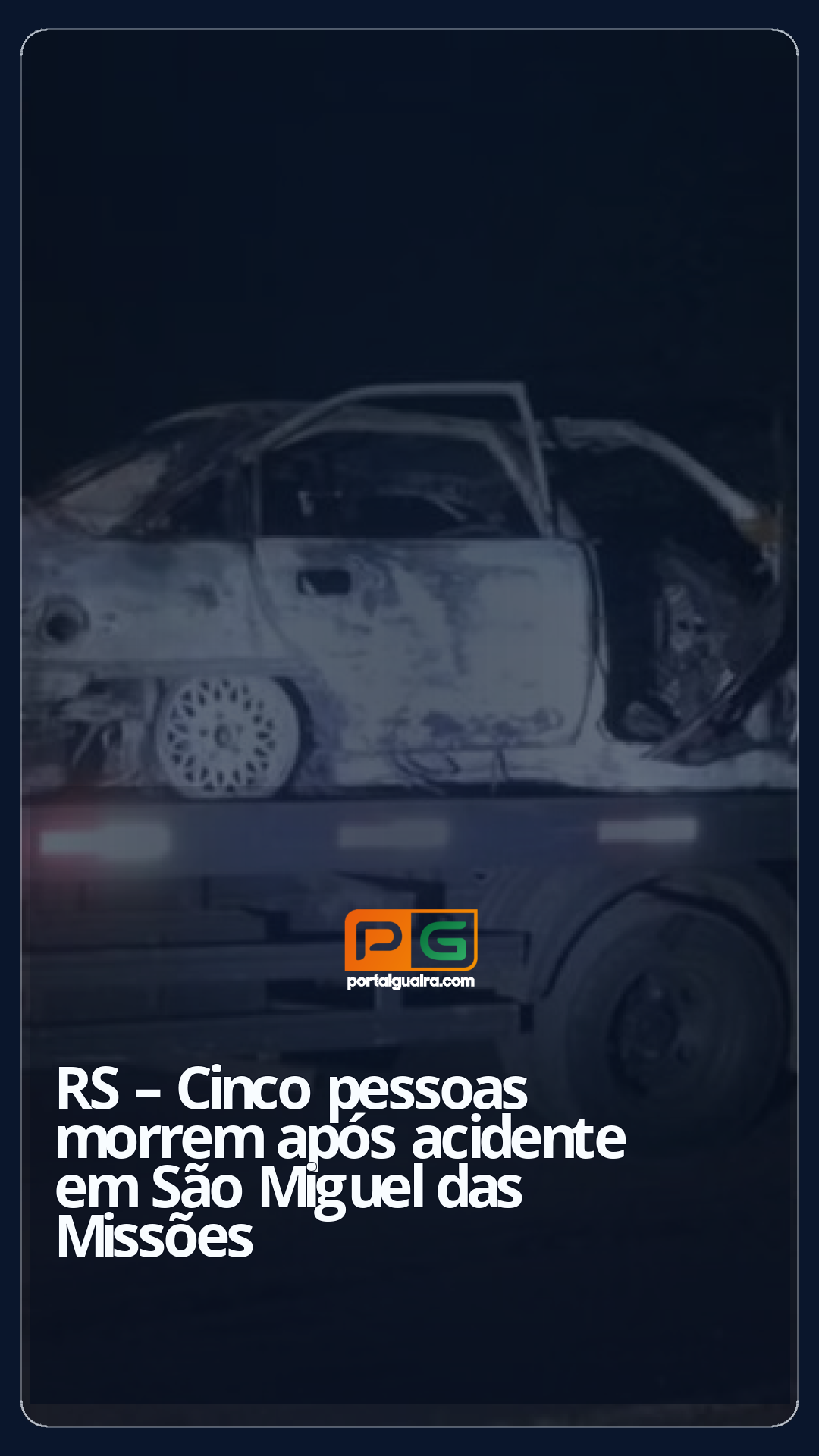 Uma colisão frontal deixou 5 mortos na noite de terça-feira (31), poucas horas antes da virada do ano, na RS-536, em São Miguel das Missões, no Noroeste do RS, segundo o Comando Rodoviário da Brigada Militar (CRBM).