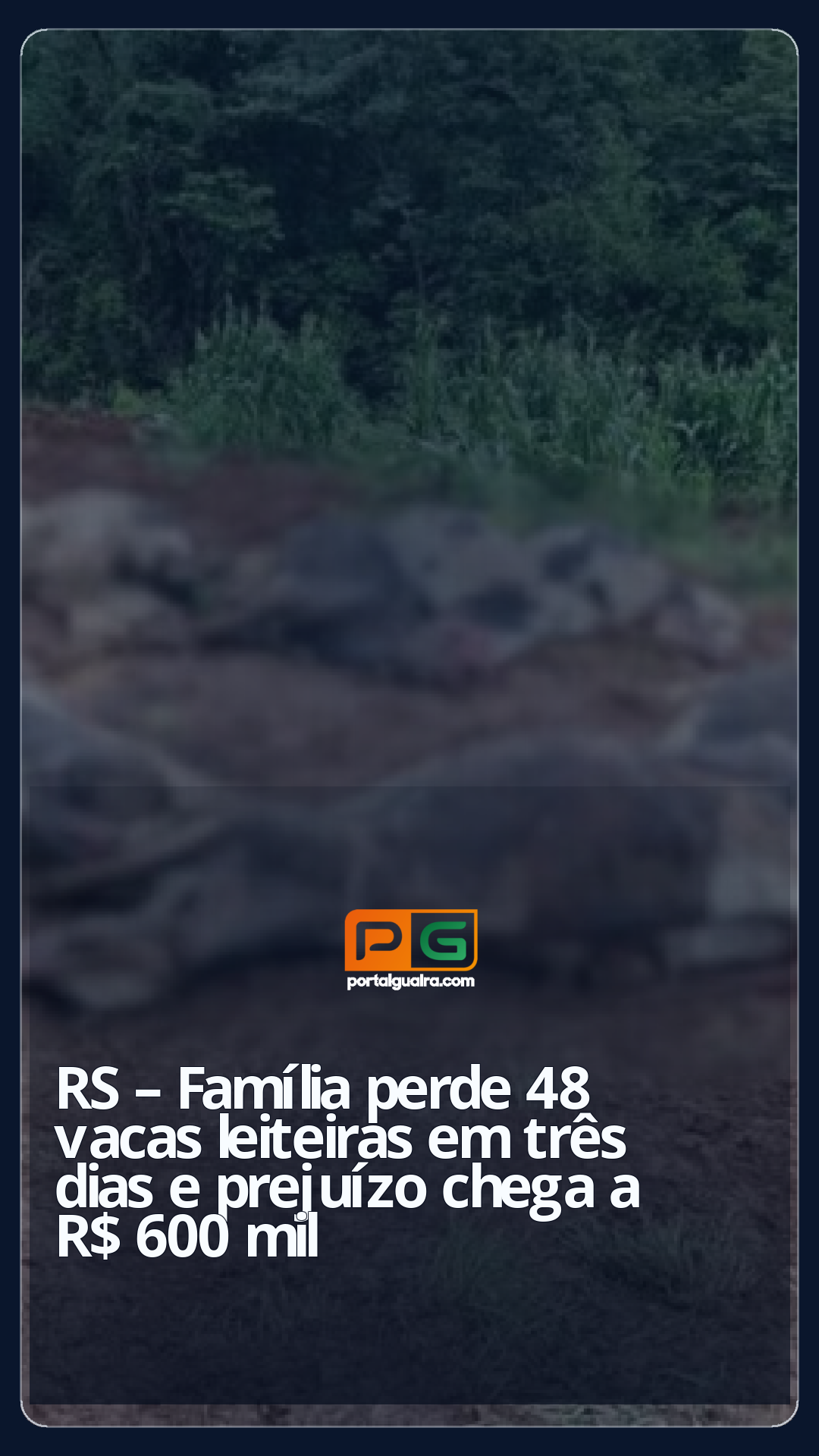 Uma família de agricultores perdeu 48 vacas leiteiras em um intervalo de três dias em Novo Xingu, município com 1,6 mil habitantes no Norte do Rio Grande do Sul. O caso começou no dia 2 de janeiro, em uma propriedade na Linha Cotia, área rural do município. A principal suspeita é de intoxicação dos animais por excesso de nitrito.