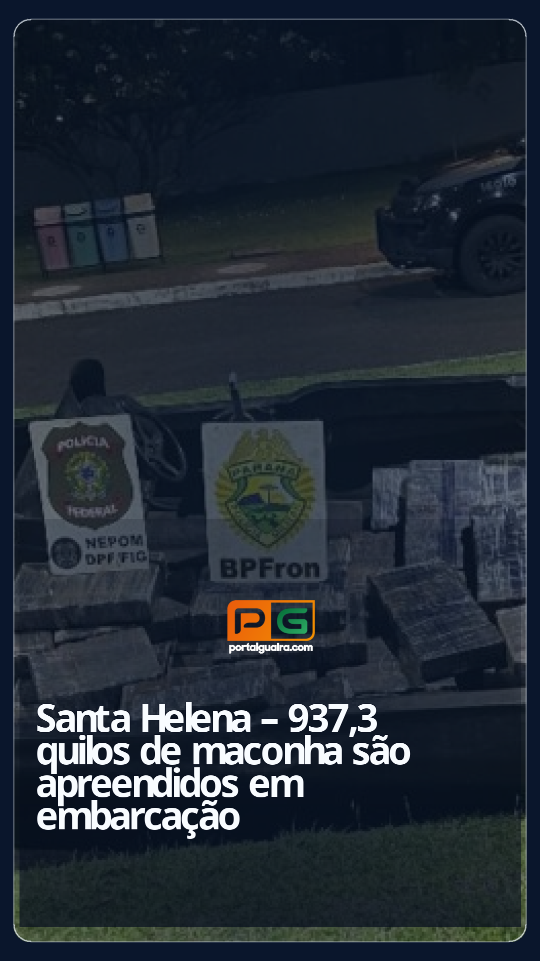 937,3 kg de maconha prensada foram encontrados dentro de uma embarcação de fibra com motor Yamaha de 200 HP, que se dirigia a um porto clandestino na região da “Barraca do Paraná”, em Santa Helena Velha, município de Santa Helena. A droga estava dividida em 66 fardos.