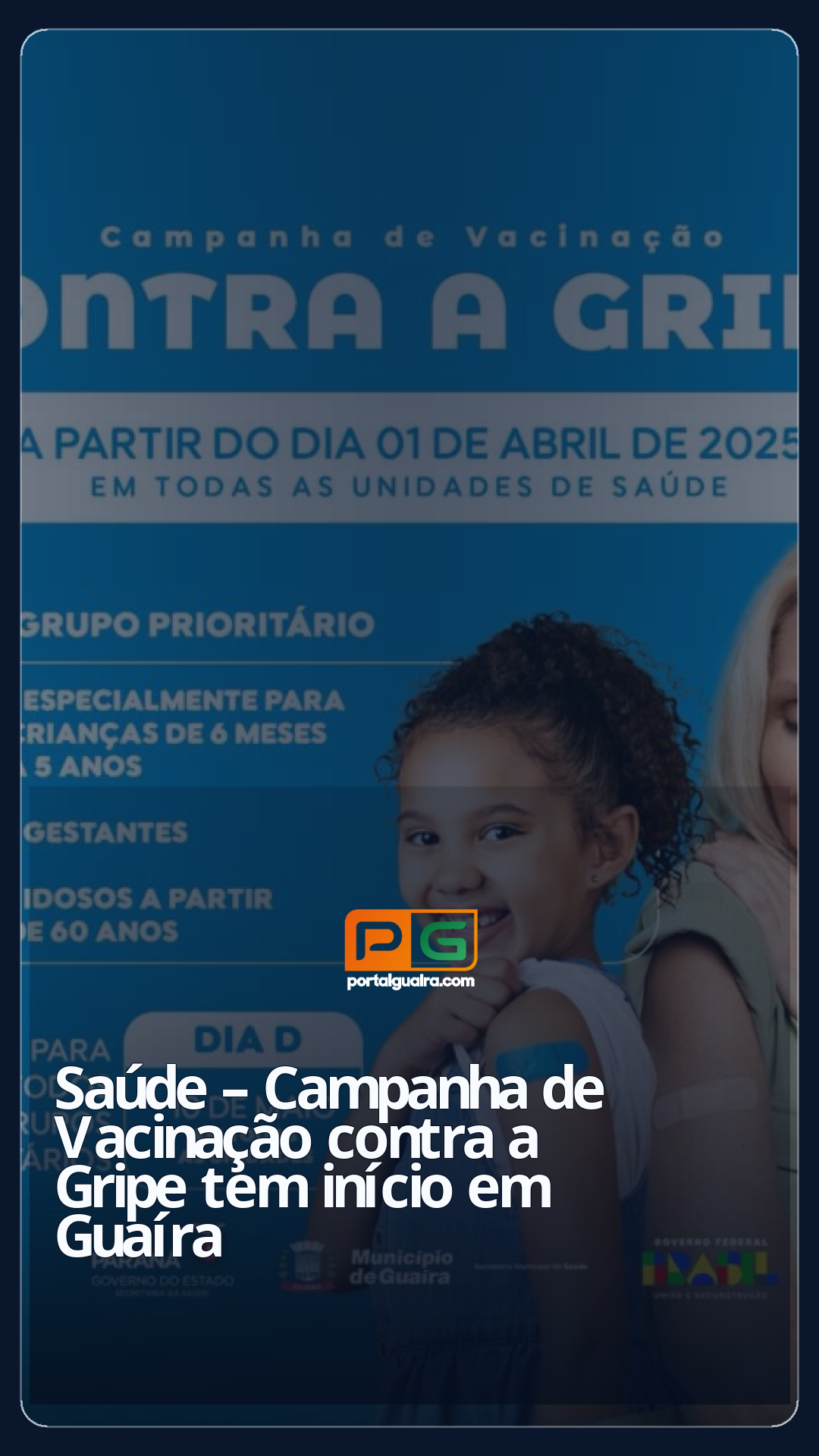 A Campanha de Vacinação contra a Gripe começou na terça-feira, 1º de abril de 2025, em todas as Unidades de Saúde da Família do Município de Guaíra. Nesta primeira etapa, a imunização está disponível para dois grupos prioritários: crianças de 6 meses a 5 anos e gestantes, além de idosos a partir de 60 anos.