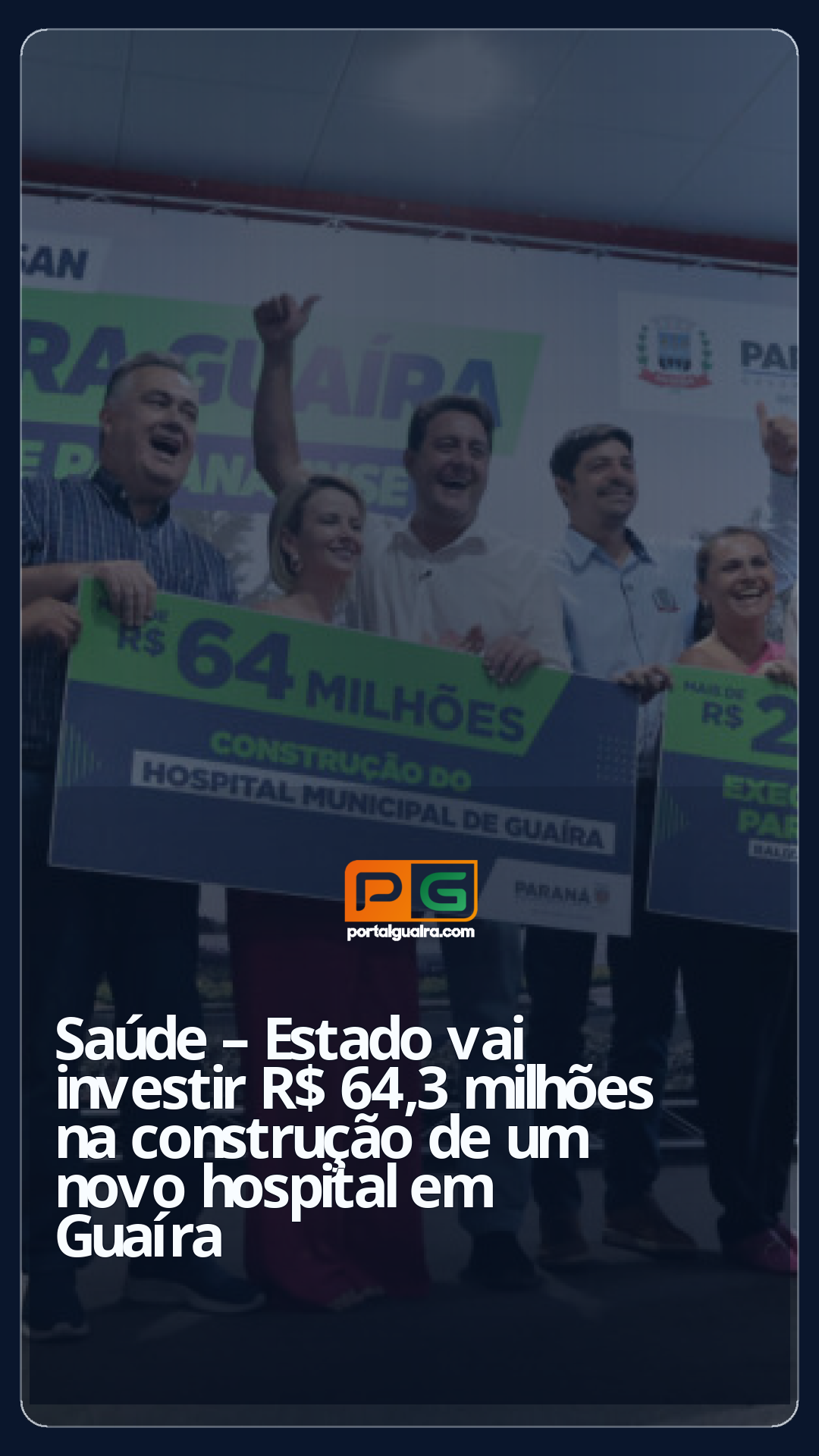 O Governo do Estado vai investir R$ 64,3 milhões na construção do Hospital Municipal de Guaíra Graciele Possan. A autorização para a licitação para implantar a nova unidade foi feita nesta quinta-feira (22) pelo governador Carlos Massa Ratinho Junior e pelo secretário de Estado da Saúde, Beto Preto.