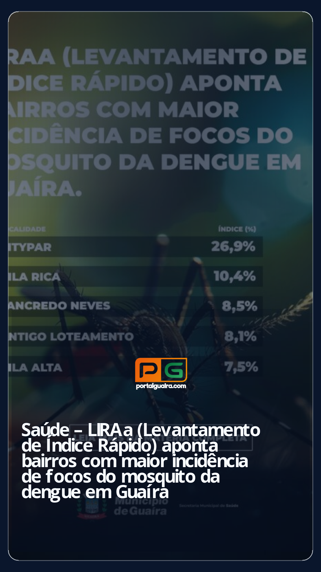 O Município de Guaíra, por meio da equipe de Endemias da Secretaria de Saúde, realizou entre os dias 05 e 08 de maio de 2025 o 3º ciclo do Levantamento de Índice Rápido para o Aedes aegypti (LIRAa). O levantamento é feito a cada dois meses e tem como objetivo identificar as regiões da cidade com maior presença de focos do mosquito transmissor da dengue, zika e chikungunya.