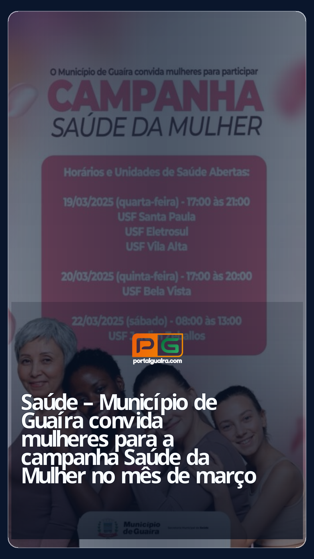 O Município de Guaíra por intermédio da Secretaria Municipal de Saúde convida a população de cada USF – Unidade Saúde da Família, a participar, conforme cronograma: