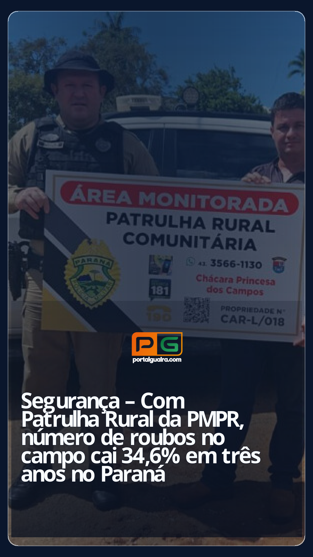 O Programa Patrulha Rural Comunitária 4.0, da Polícia Militar do Paraná (PMPR), registrou uma queda de crimes nas regiões rurais do Estado entre 2024 e 2022, começo da ação. Os dados foram mapeados, analisados pela Coordenadoria de Patrulha Rural Comunitária e apresentados na segunda-feira (7).