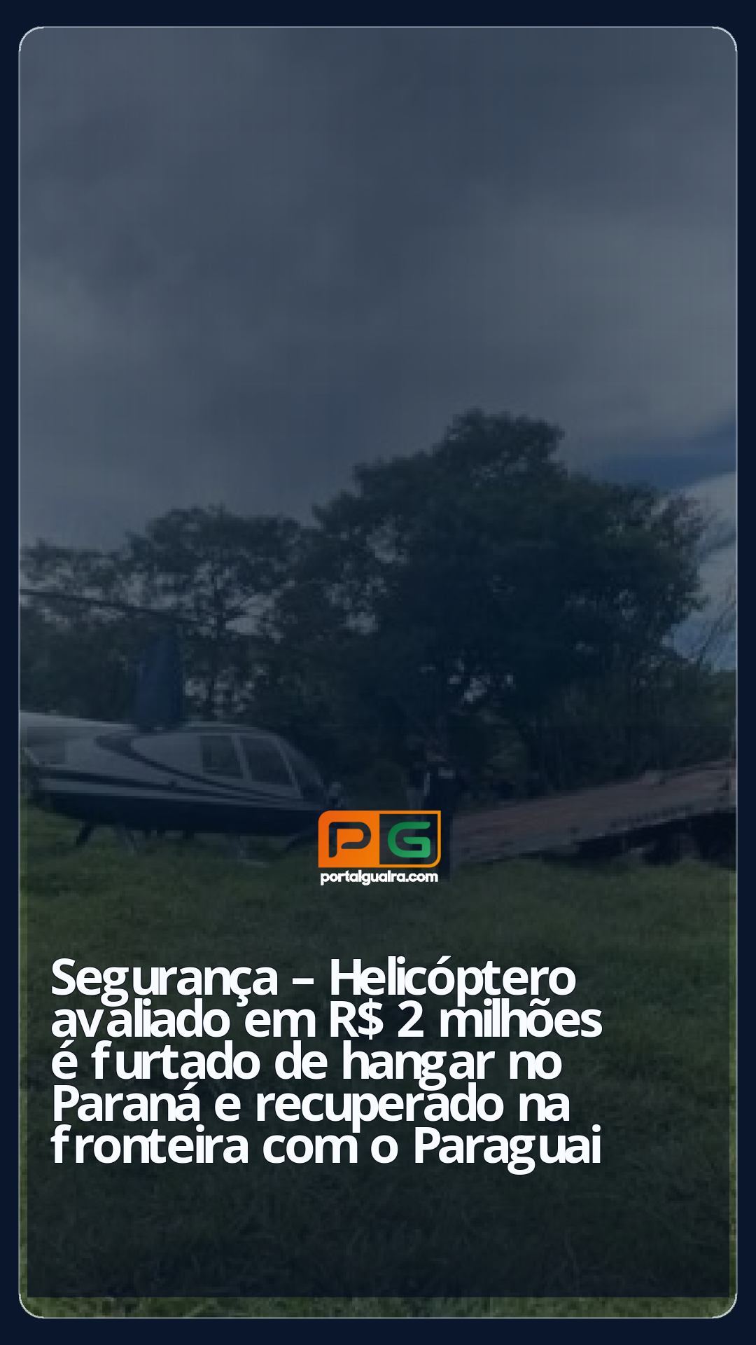 Um helicóptero, avaliado e R$ 2 milhões, foi furtado de um hangar em Porecatu, na PR-170, no norte do Paraná. A aeronave foi localizada e recuperada na fronteira entre o Paraguai e o estado do Mato Grosso do Sul.
