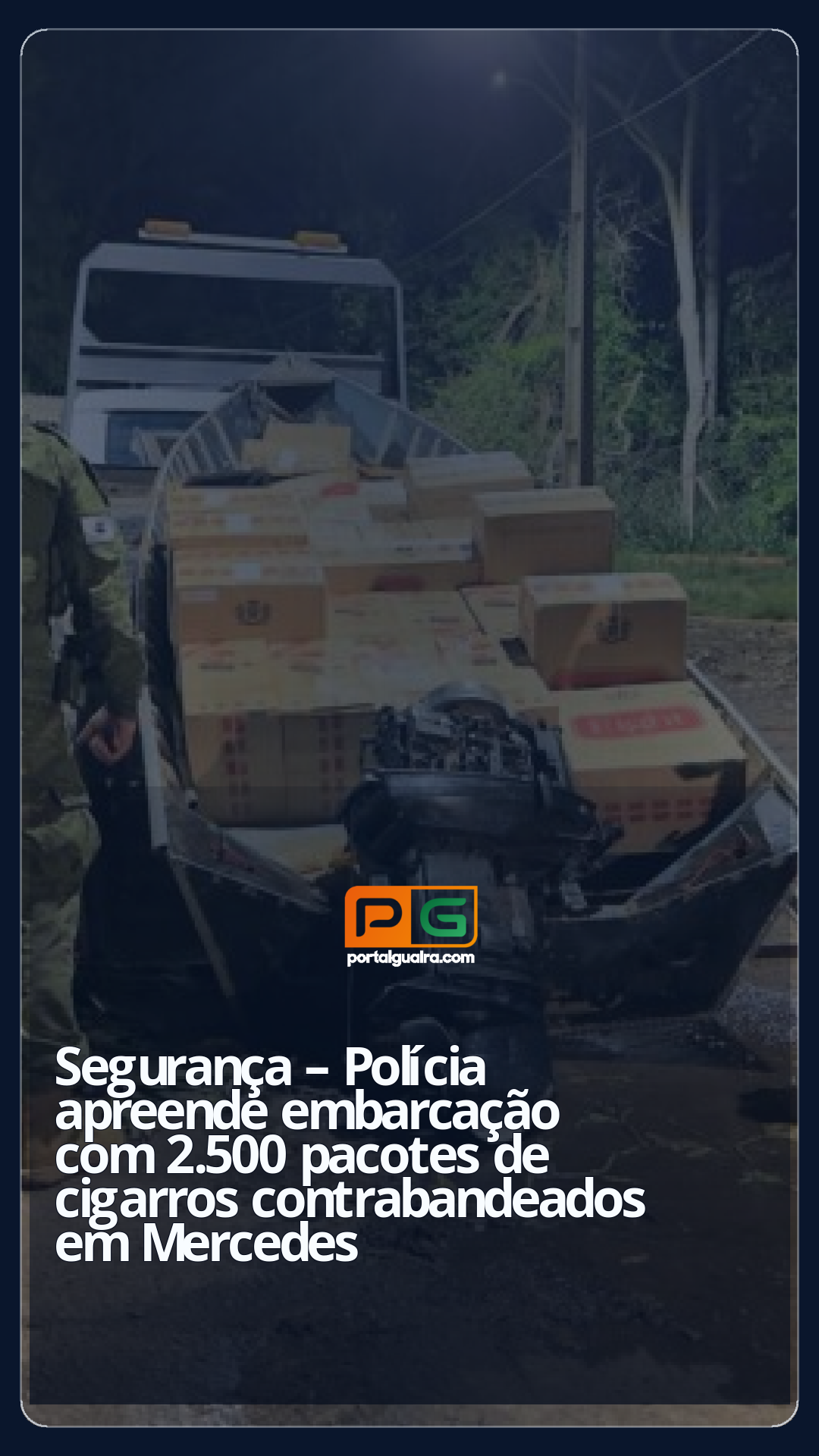 No local, os agentes encontraram uma embarcação de alumínio de aproximadamente 7 metros, equipada com motor de popa com características suprimidas, possivelmente um Mercury 40 HP. Dentro, havia 2.500 pacotes de cigarros contrabandeados.