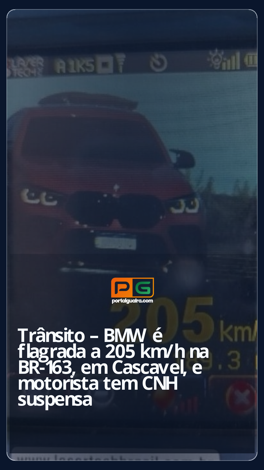 Uma BMW foi flagrada a 205 km/h na sexta-feira (23) na BR-163, em Cascavel, durante uma fiscalização da Polícia Rodoviária Federal (PRF) em um trecho onde o limite é de 110 km/h.