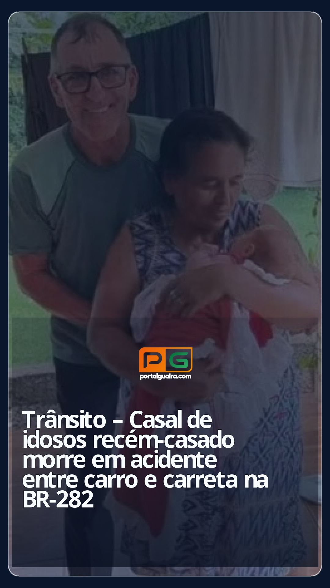 Um casal de idosos morreu em um acidente na BR-282, em Iraceminha, no Oeste de Santa Catarina. As vítimas foram identificadas como Ivanir Falkovski, de 61 anos e Norandir Batista, de 59 anos, ambos moradores de Flor do Sertão.