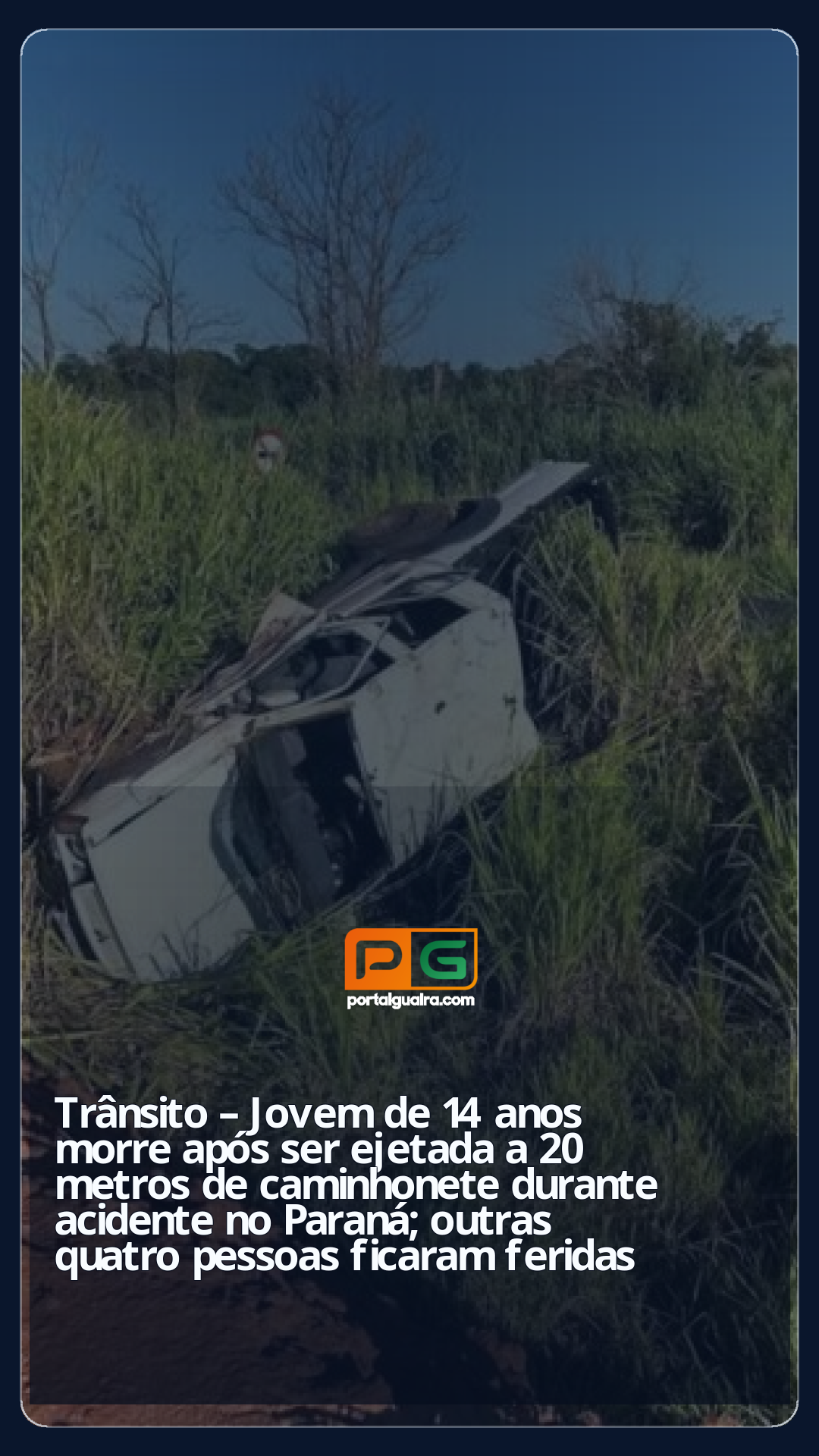 Uma jovem de 14 anos morreu após ser ejetada a 20 metros de uma caminhonete durante um acidente na manhã deste sábado (22), na PR-317, em Nossa Senhora das Graças, no norte do Paraná. Outras quatro pessoas que estavam no veículo ficaram feridas e foram encaminhadas para hospitais da região.