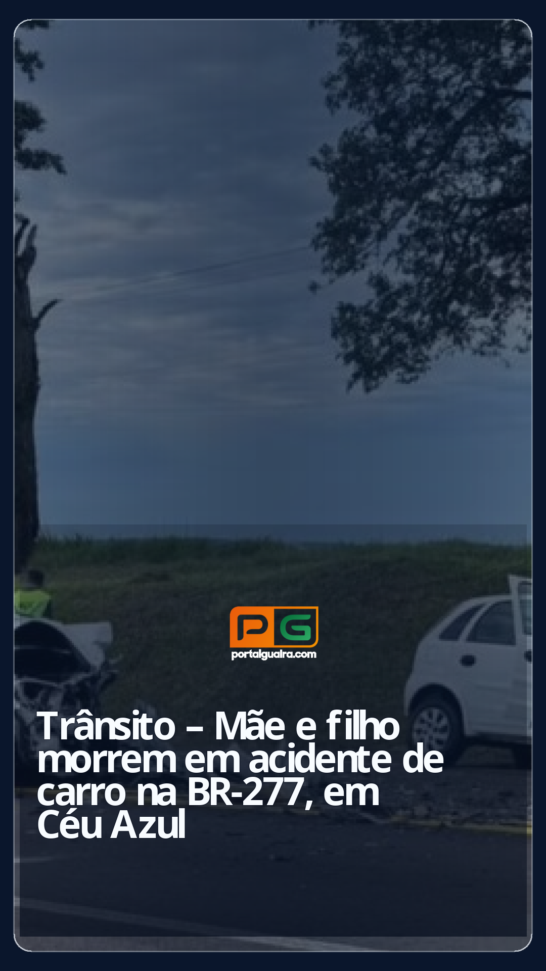 Mãe e filho, de 62 e 38 anos, morreram em um acidente na BR-277, em Céu Azul, na manhã de segunda-feira (1º). Outras seis pessoas ficaram gravemente feridas após uma colisão frontal no km 646 da rodovia, segundo a Polícia Rodoviária Federal (PRF). As identidades das vítimas não foram divulgadas.