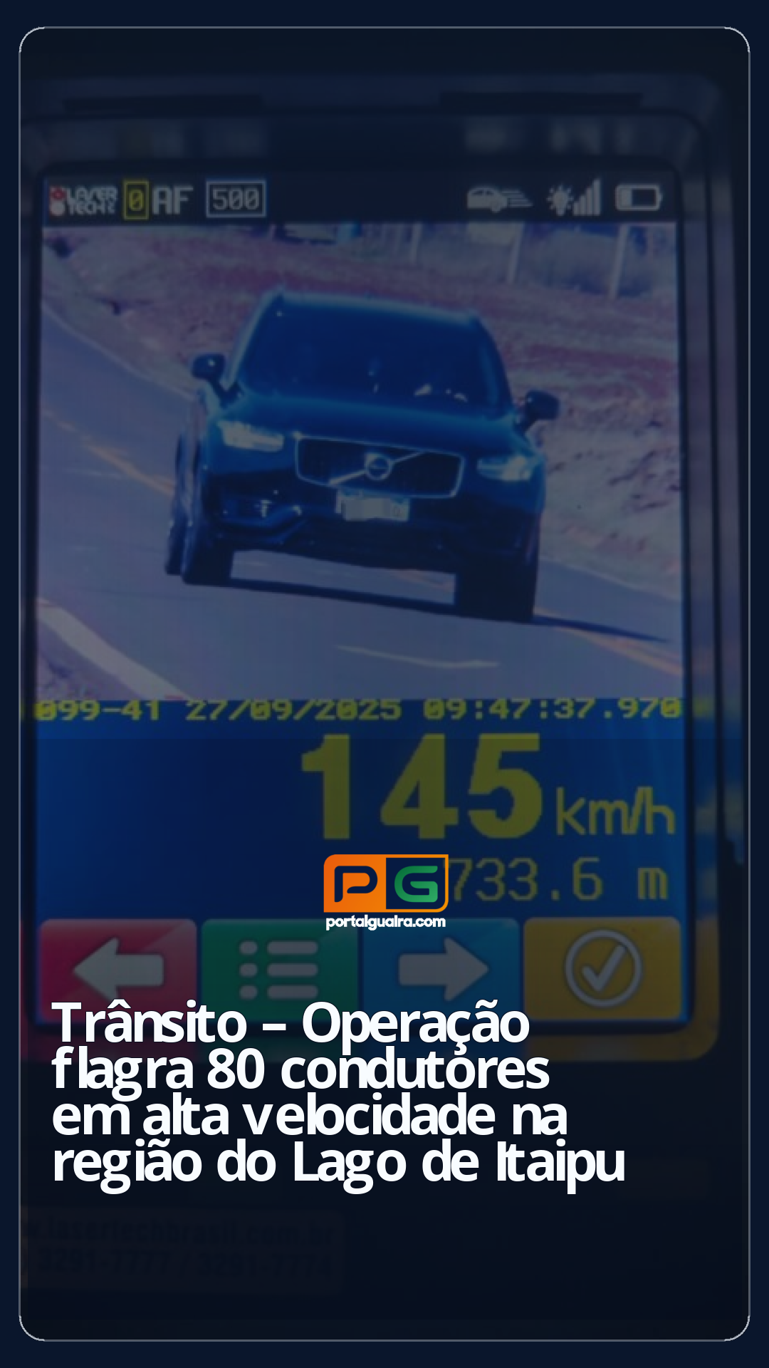 A Polícia Militar do Paraná (PMPR), por meio do Batalhão de Polícia Rodoviária (BPRv), realizou na manhã de sábado (27), uma operação de fiscalização de velocidade nas rodovias lindeiras ao Lago de Itaipu. A ação ocorreu nos trechos entre Missal e Santa Helena, e entre São Miguel do Iguaçu e Itaipulândia, abrangendo as PR-495 e PR-497.